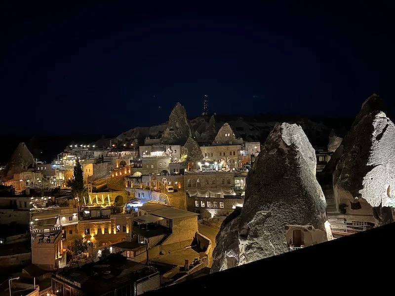 After we finished the Hammam and lunch in Istanbul, we took a one our drive to Istanbul airport and after waiting there for a few hours flew into Nevshehir airport. We had arranged transport through the hotel (we were to pay per person and were told to pay in Turkish currency but the total was in Euro!). Had to have it ready when we we entered the van. The van guy waited till he could find some last minute unplanned passengers to fill and finally after 35 minutes started towards Kapadokya. A middle aged woman who was flirty decided to sit in the front set next to the driver. It was dark and windy roads with no lights and she kept showing him her phone and making conversation. The driver was obviously taken in with this and was not focusing on the road. The rest of us got very nervous after the driver swerved a few times. So as a collective we spoke up and asked her to stop talking to him or distracting him while driving. The rest of the ride was relatively uneventful. Finally after dropping off 80% of the folks we got our turn.