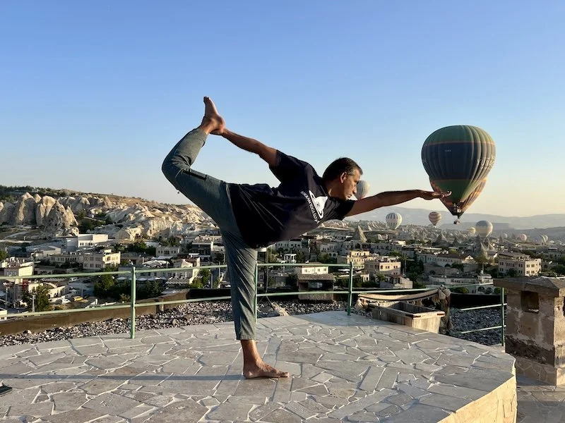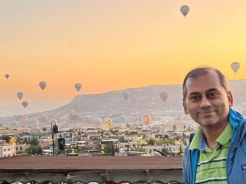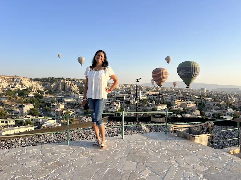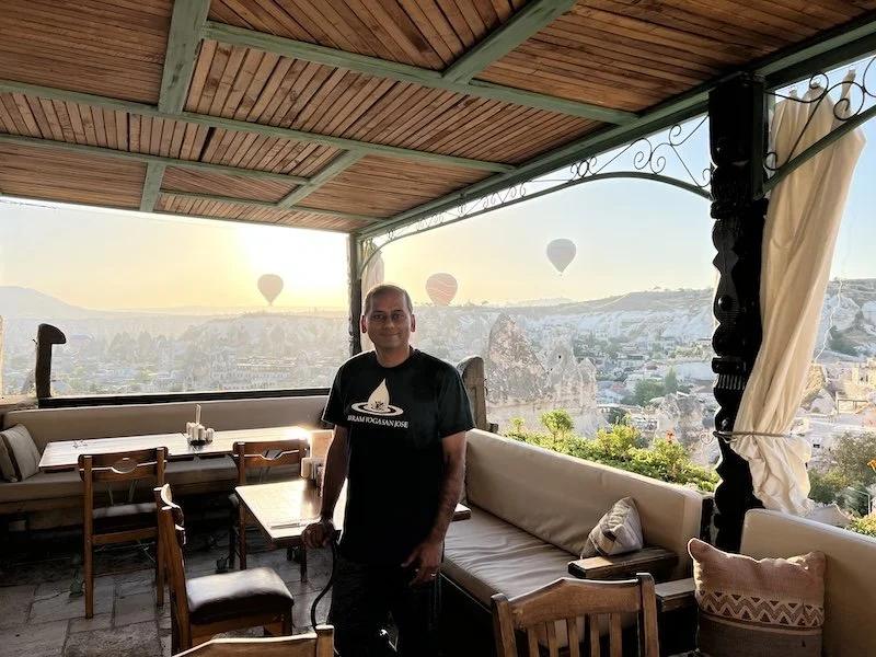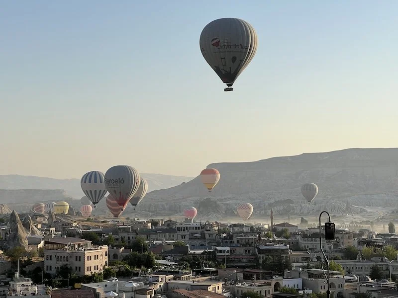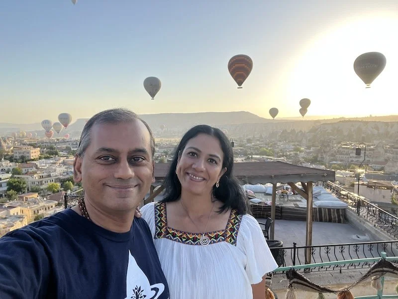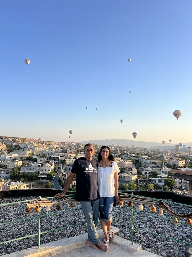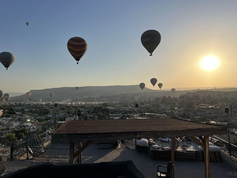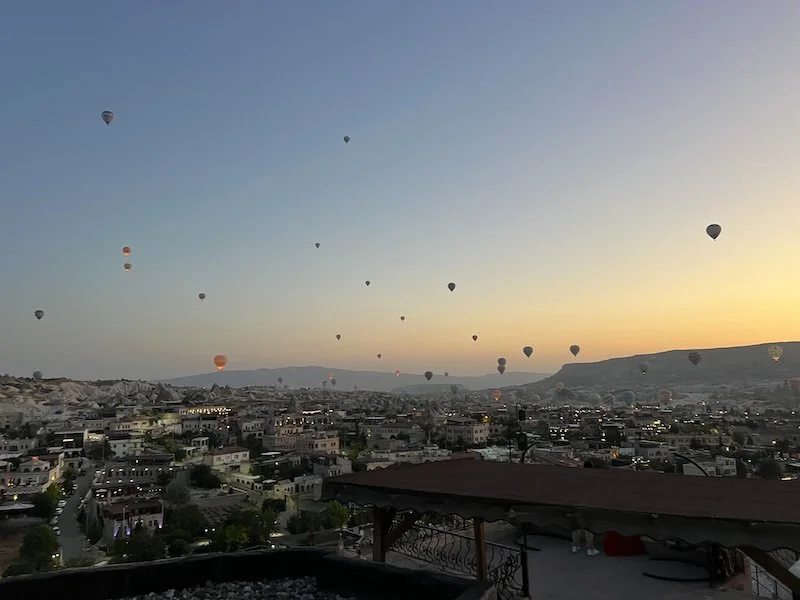 The staff at the cave hotels were nice. The manager gave us a crash course on what to expect and what to do in the morning. Will write a separate post on the cave hotels. The rooms are carved from the rocks. They are all on a hill. We were all tired but I decided to see the balloons rise at 5AM. Turns out they went up only closer to 6! It was beautiful to see. San joined me on the roof for some photos and decided to go dress up and come back for more photos!