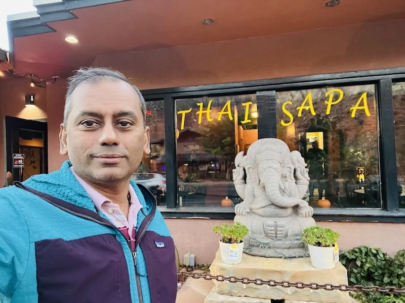 After making our way back we took the shuttle to the visitor center, and then drove back to our cabin. We were going to have some chai and biscuits in the porch. Then we changed and found dinner. There was a place called Thai Sapa which the ladies had an eye on… what with the big Ganesha greeting them… so we went there. Given my allergies I usually don’t go anywhere near Thai places and ended up eating a Pizza there.